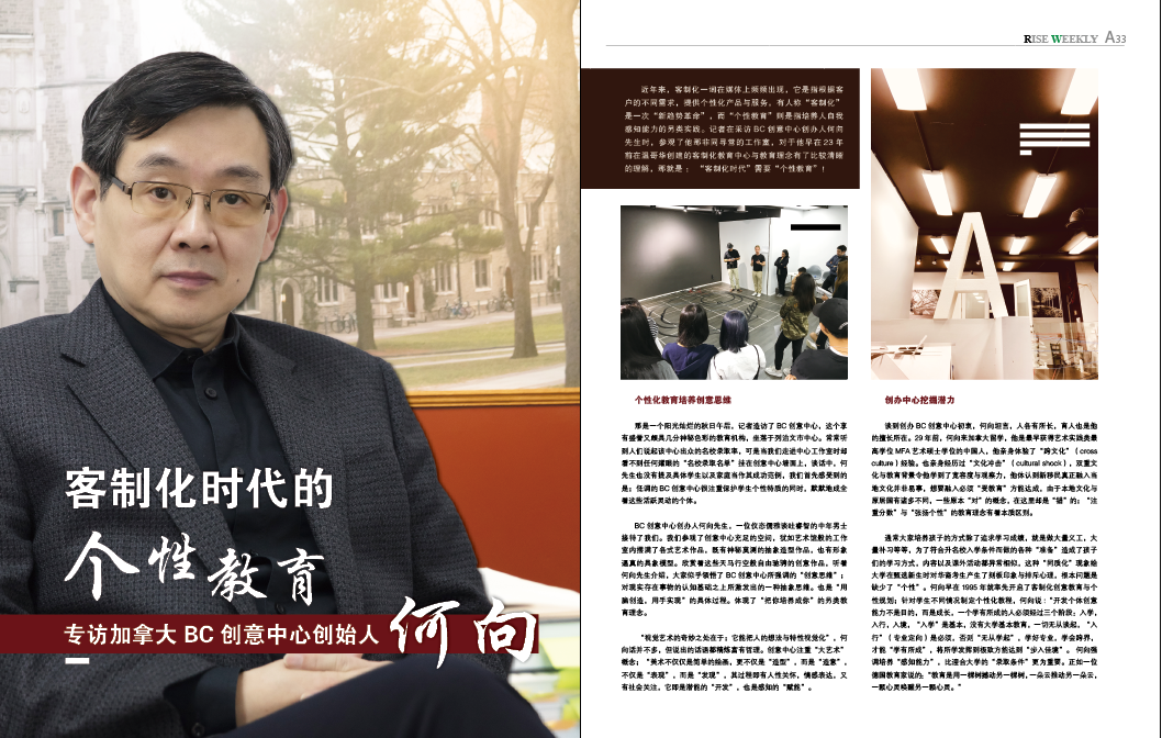 近年来,客制化一词在媒体上频频出现,它是指根据客户的不同需求,提供个性化产品与服务,有人称“客制化”是一次“新趋势革命”,而“个性教育”则是指培养人自我感知能力的另类实践。记者在采访BC创意中心创办人何向先生时,参观了他那非同寻常的工作室,对于他早在23年前在温哥华创建的客制化教育中心与教育理念有了比较清晰的理解,那就是:“客制化时代”需要“个性教育”!