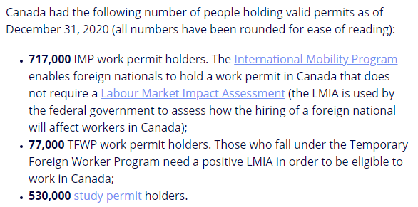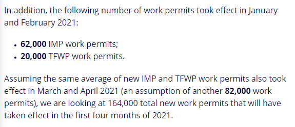 根据加拿大移民部统计,2021年第一季度期间就发放了12.4万个IMP和4万个TFWP。