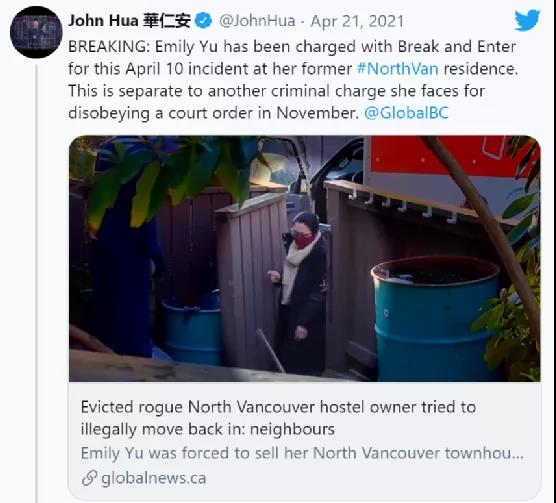 本来一个民事纠纷,现在给警察逮住,好了,变成刑事案件了,Global News称,也正因为堵门这一举动,Yu女士现在还被追究刑事责任。此外,BC省最高法院还同时勒令Yu女士在当年的11月底之前搬出去。