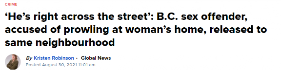 BC省大维多利亚地区Esquimalt市的居民近日如遭晴天霹雳——一名被定罪的性犯罪者不仅被警察放了出来,而且还被安置在了他原来的居民区,与受害者仅有一街之隔。