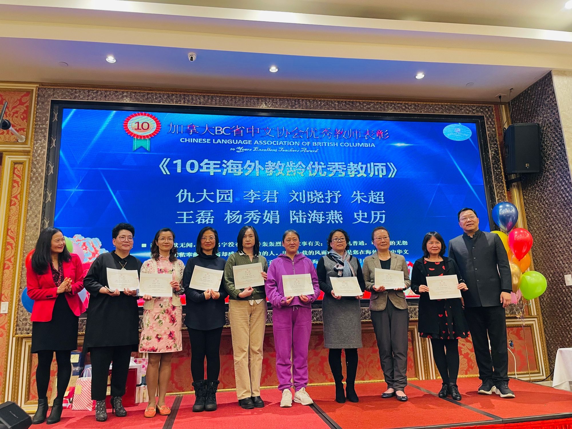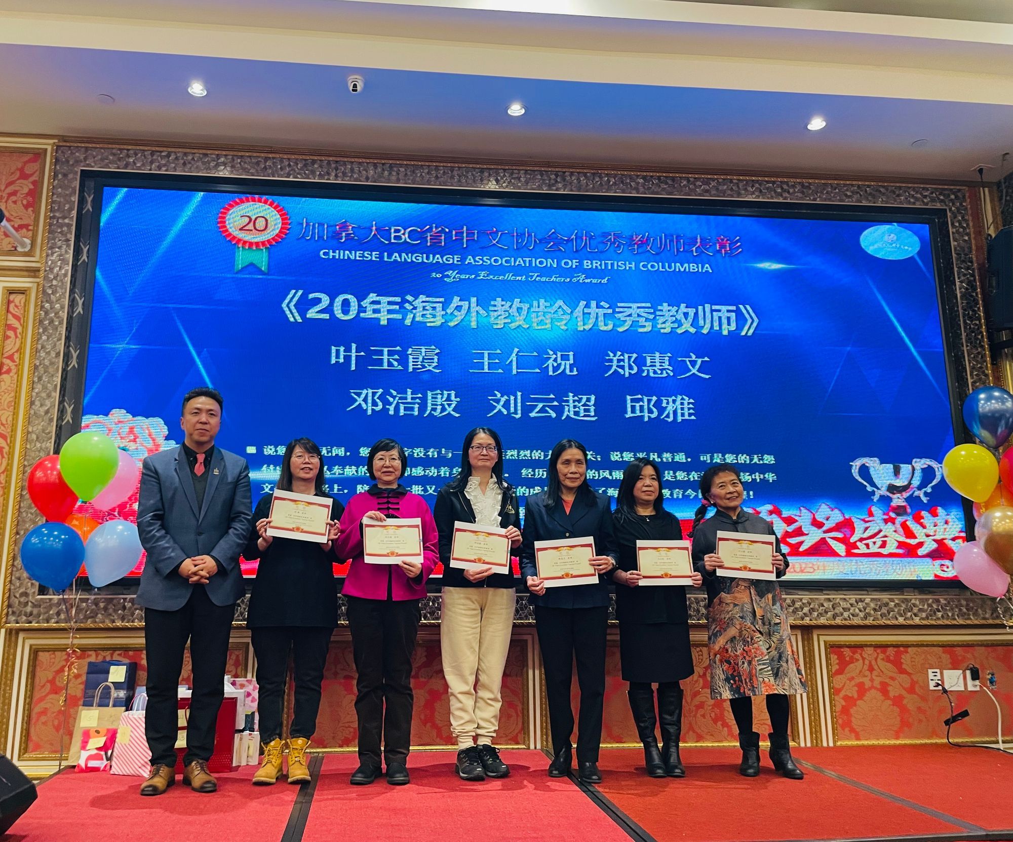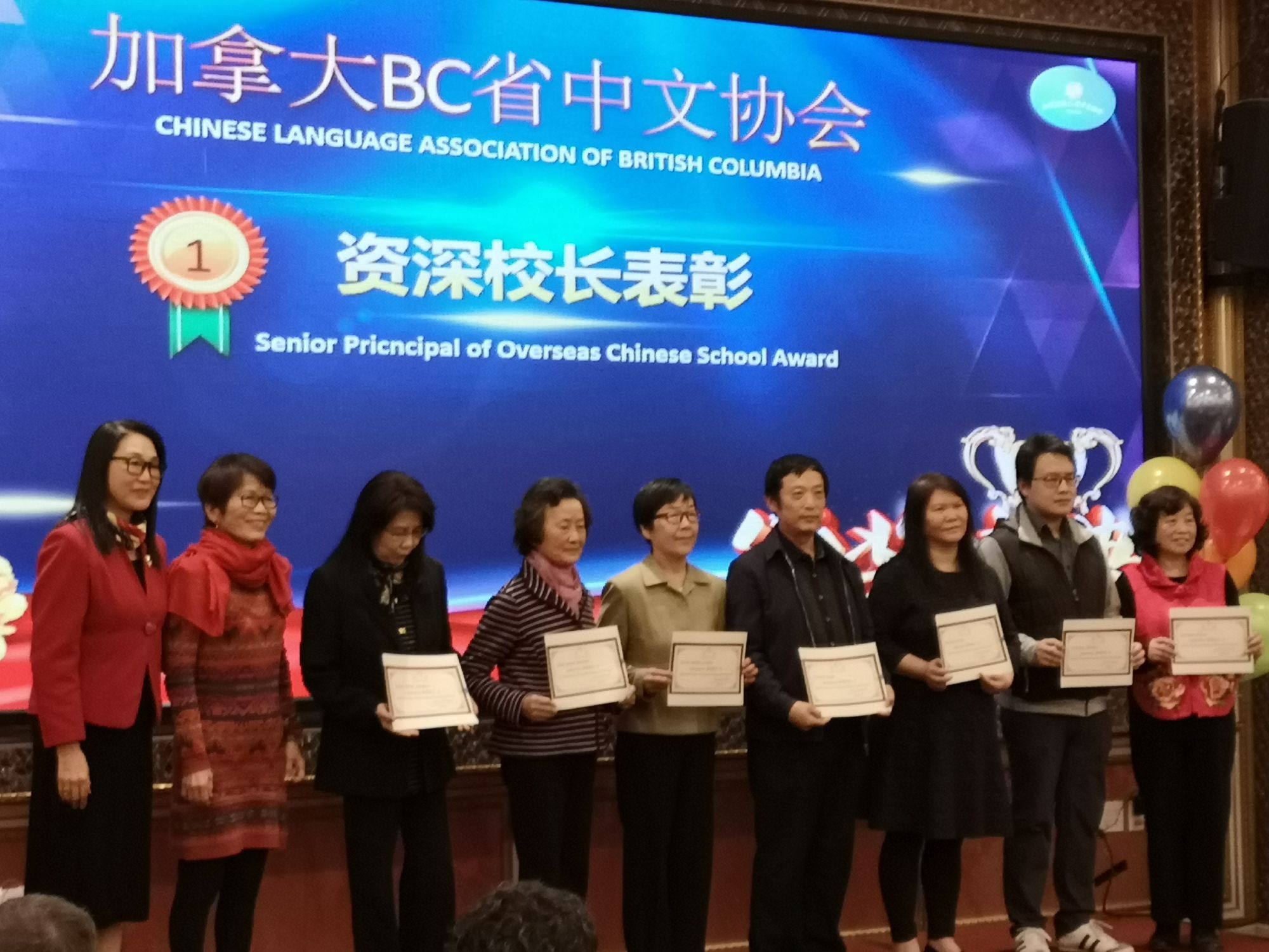 接着,杨舒总领事、张毅博领事和省市议员们、UBC大学李国芳教授、加拿大中华会馆理事长钱华女士、加拿大华人社团联席会执行主席薛晓梅女士、加拿大华人联合总会会长牛华先生、全加华人联会主席蔡宏安先生、加拿大太平洋合众学院董事长李卉女士、加华视讯WOWTV加西总裁陈龙先生、列治文教育局奖学金赞助人李珍老师,她力量全球女性俱乐部主席文卷女士等嘉宾分别为荣获资深中文学校校长及10年、15年和20年优秀教师奖的校长老师们颁发了奖状。