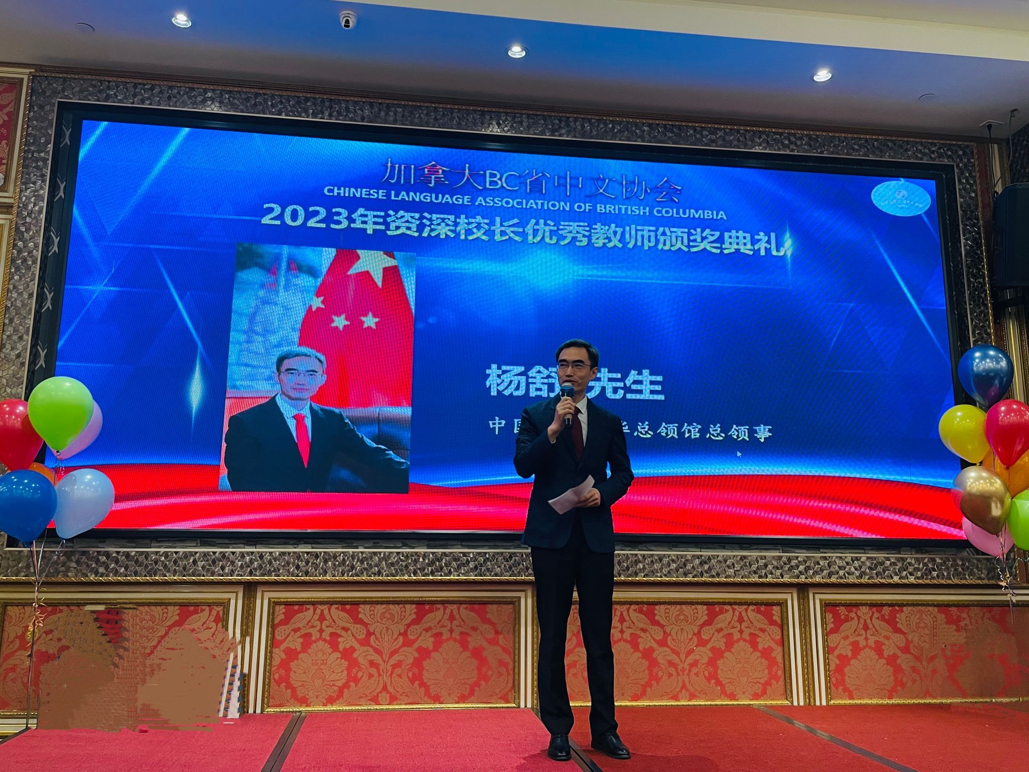 中国驻温总领馆杨舒总领事在致辞中热情赞扬了BC省中文协会四十余年辛勤耕耘、无私奉献,为弘扬中华文化做出了巨大的贡献。他说,中华文化是中华儿女共同的魂,希望广大华文教师将中文教育这个留根工程做好并用语言这个工具为中加友好贡献力量。