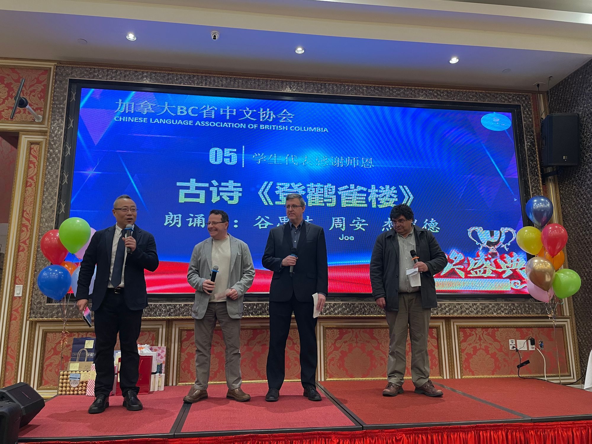 执教20年的兰加拉国语学校的王仁祝老师代表获奖老师发表了感言,温哥华北京中文学校毕业生王海伦眼科医生和中文学校在读生李偶然律师现身说法,凸显了教和学中文的重要性。接着,快乐中文学校学生《教师赞歌》再一次激起了在场老师们热烈的掌声。中文学校毕业生、现任歌剧教师的王甜甜带领几位身穿白色、浅绿和藕荷色衣服的学生们,每人手握一束鲜花,载歌载舞,以一曲优美的《茉莉花》征服了全场,展现了孩子们学习中文的成果和风采。而三名西人成人学生谷思达、周安和杰瑞德字正腔圆和声情并茂的诗朗诵《登鹳雀楼》则将气氛推向了高潮,全场顿时响起了百人应答:白日依山尽,黄河入海流。欲穷千里目,更上一层楼。