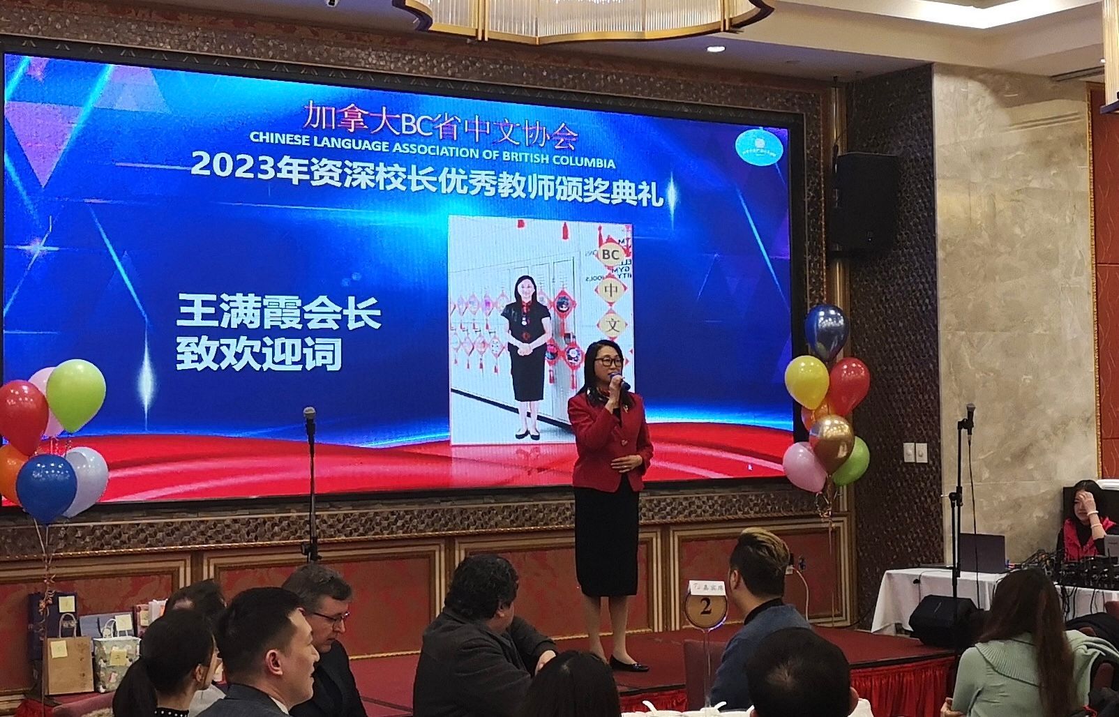 BC省中文协会会长王满霞女士在致辞中回顾了历届理事会和广大华文教师数十年如一日为推广中文教育、弘扬中华文化和丰富加拿大多元文化所作的无私奉献。她说,在海外的华侨华人及华文教育工作者身上看到了中华民族困难面前不低头,不屈不挠,永往直前的精神。各中文学校校长及海外华文教师靠着夸父追日、精卫填海和愚公移山坚韧不拔的精神,捍卫了海外中文教育的这块阵地,保持和传承了中华文化。