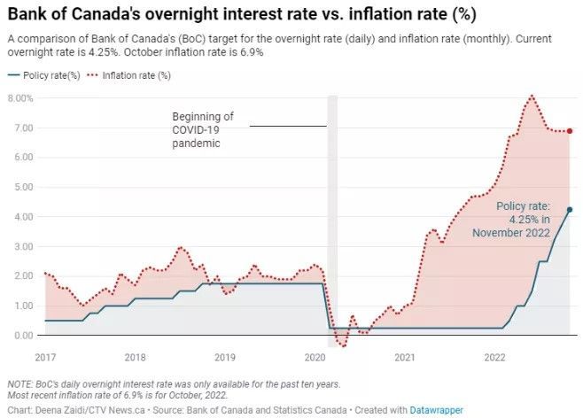 回望2022年,通胀来势凶猛,一下子从年初的5.1%上涨到6月份8.1%的近四十年历史高点。之后通胀虽稍有回落,但目前仍然保持在7%左右的水平。加拿大央行的政策目标是保持通胀在2%左右。