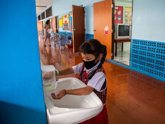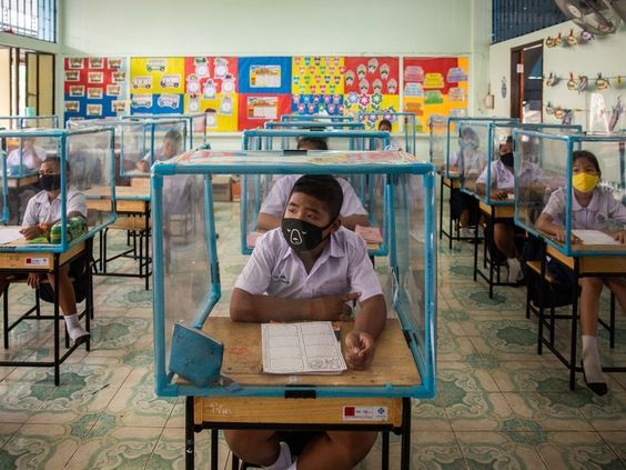 泰国要求学生佩戴口罩,桌椅之间有塑料隔板,同时保持社交距离。泰国幼儿园也要求孩子戴口罩,并勤洗手。这些照片拍摄于2020年8月10日,在曼谷的Wat Khlong Toey小学。
