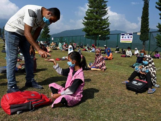 克什米尔的印度控制区里,一位老师在露天课堂中给学生提供洗手液用于消毒。照片拍摄于2020年7月28日。