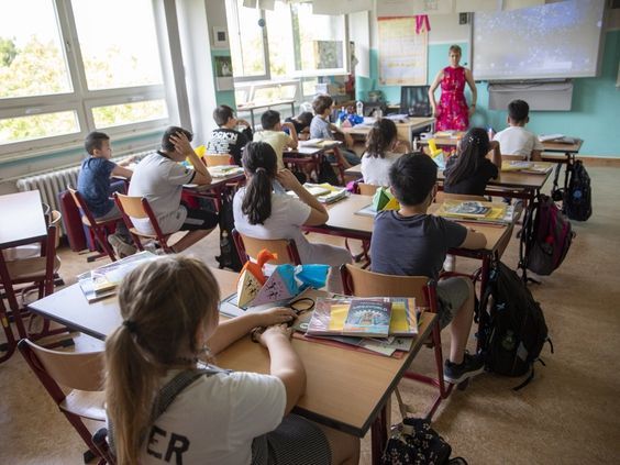 在柏林GuthsMuths小学的开学第一天,老师在教孩子们如何在疫情期间保护自己。照片拍摄于2020年8月10日。