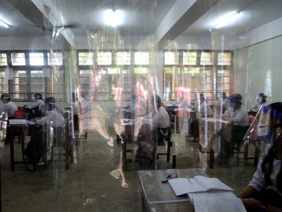 在仰光,公立高中开学第一天,教室过道安装了塑料窗帘用于隔离,学生们戴着面罩上课,并保持着社交距离。照片拍摄于2020年7月21日。