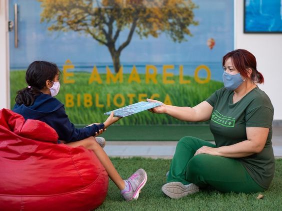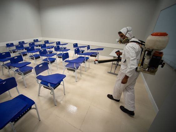 巴西利亚Arvense School开学第一天,老师将消毒过的课本交给学生。在公立学院,有专门人员对教室进行消毒。照片拍摄于2020年7月21日。
