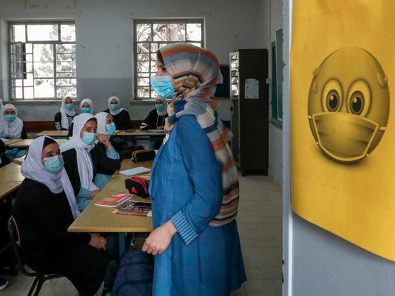 在希布伦,一位巴勒斯坦的老师在给高中生讲解开学后的防疫措施。照片拍摄于2020年8月10日。