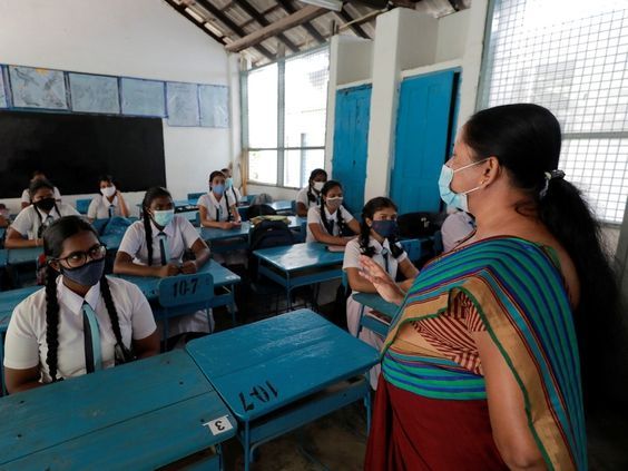 在科伦坡的Vidyakara村,学生们戴着口罩,保持1米间隔在听老师讲课。照片拍摄于2020年7月6日。