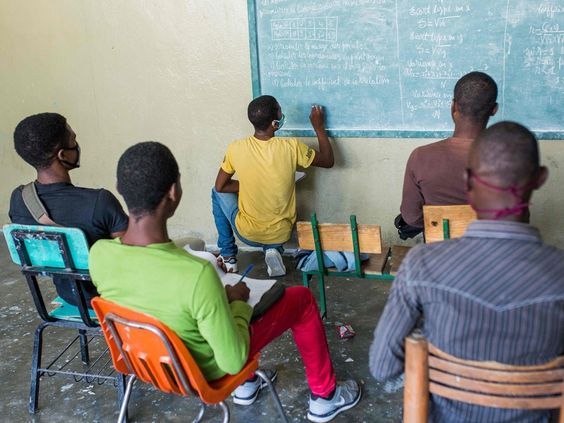 在太子港,疫情期间许多学生无法接受远程教育,因此一些高年级学生会为低年级学生补课。照片拍摄于2020年8月6日。