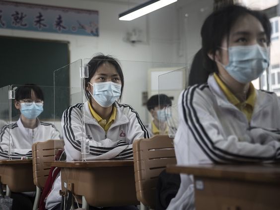 在武汉二十三中,教室中有隔板,学生都戴着口罩。照片拍摄于2020年5月6日。