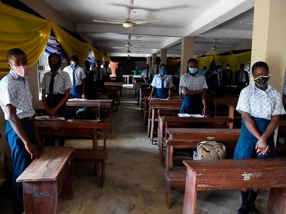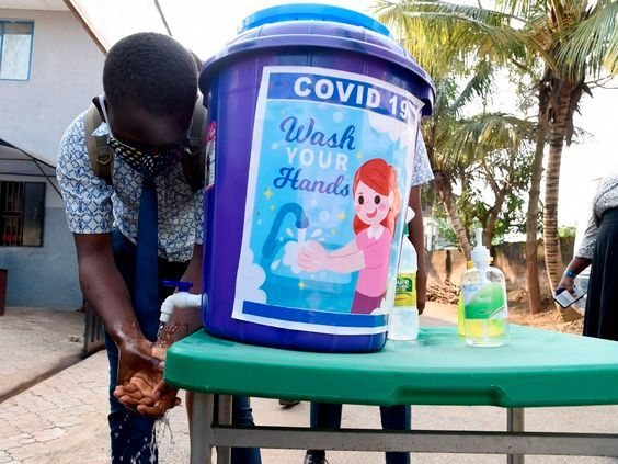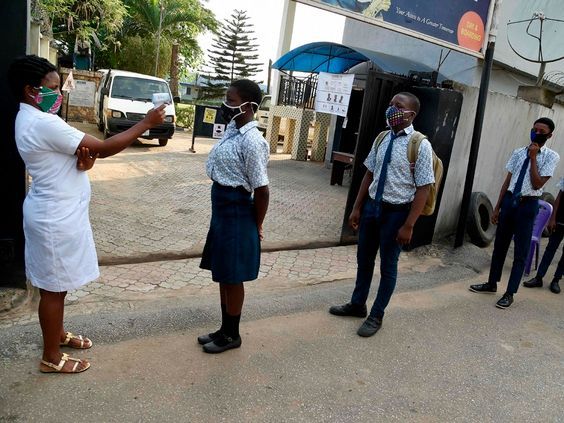 在尼日利亚的Ogun State一所国际学校中,学生在返回教室前要先洗手,在教室要戴口罩。校园门口有卫生人员检查体温,校内也要保持社交距离。以上照片拍摄于2020年8月4日。