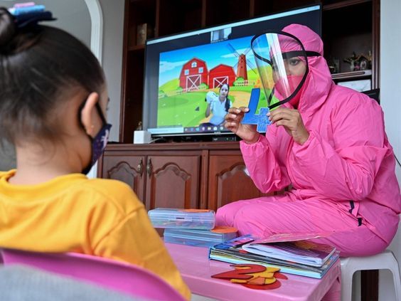 一位老师在学生家里给孩子补课,这项“家庭教师”计划是为了帮助孩子和老师保持联系,减少孩子因为在家隔离而产生的负面情绪。这张照片拍摄于2020年8月4日。