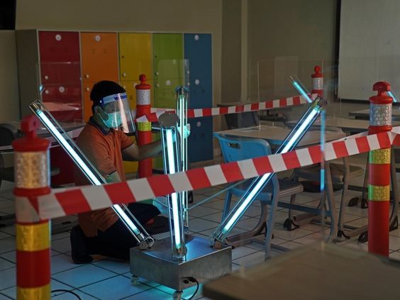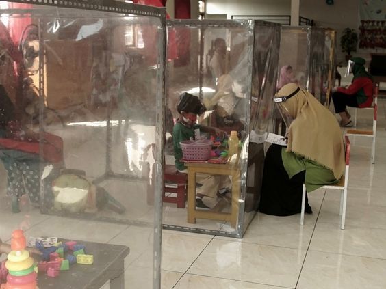 在印尼爪哇岛的勿加泗,一位维修工人戴着口罩和面罩,使用紫外线灯对教室进行消毒。在幼儿园里,老师和孩子隔着塑料隔板进行面对面的课堂学习。老师戴着面罩,隔着塑料隔板到孩子家进行家访,了解孩子在家里上网课的学习进展。照片拍摄于2020年7月22日和24日。