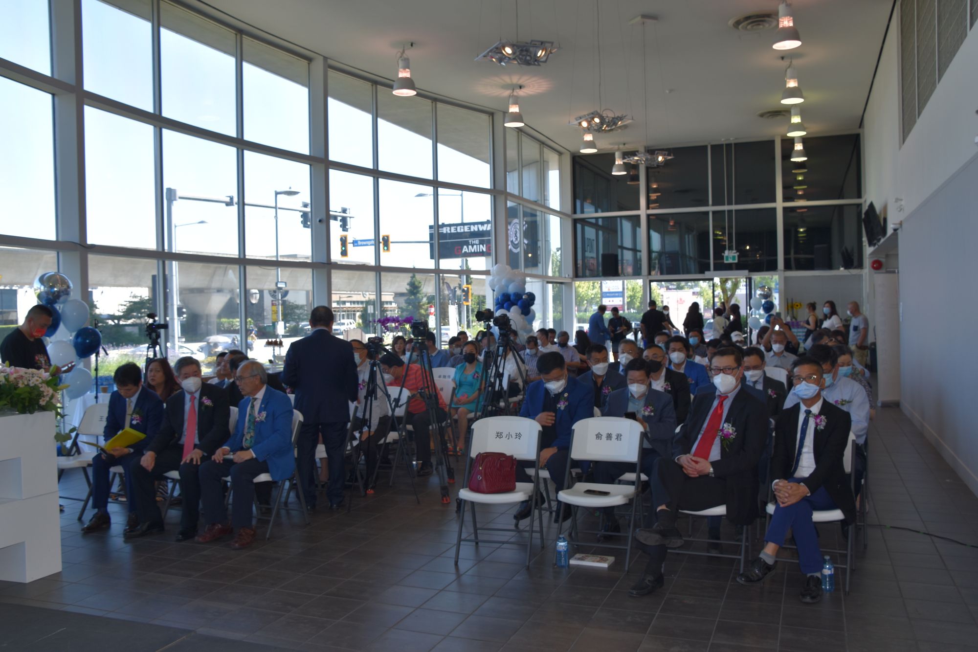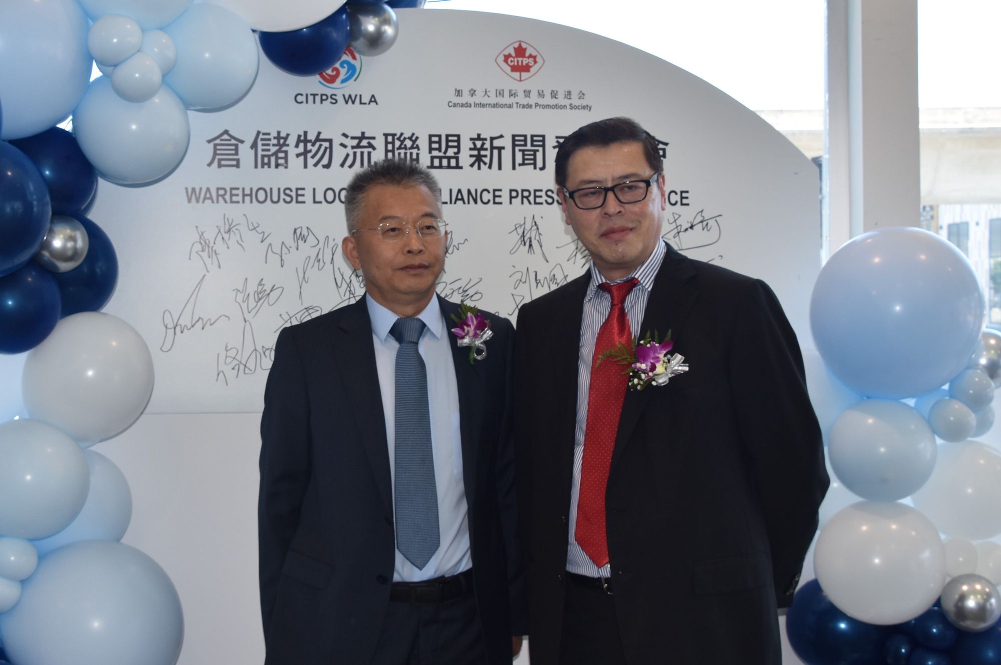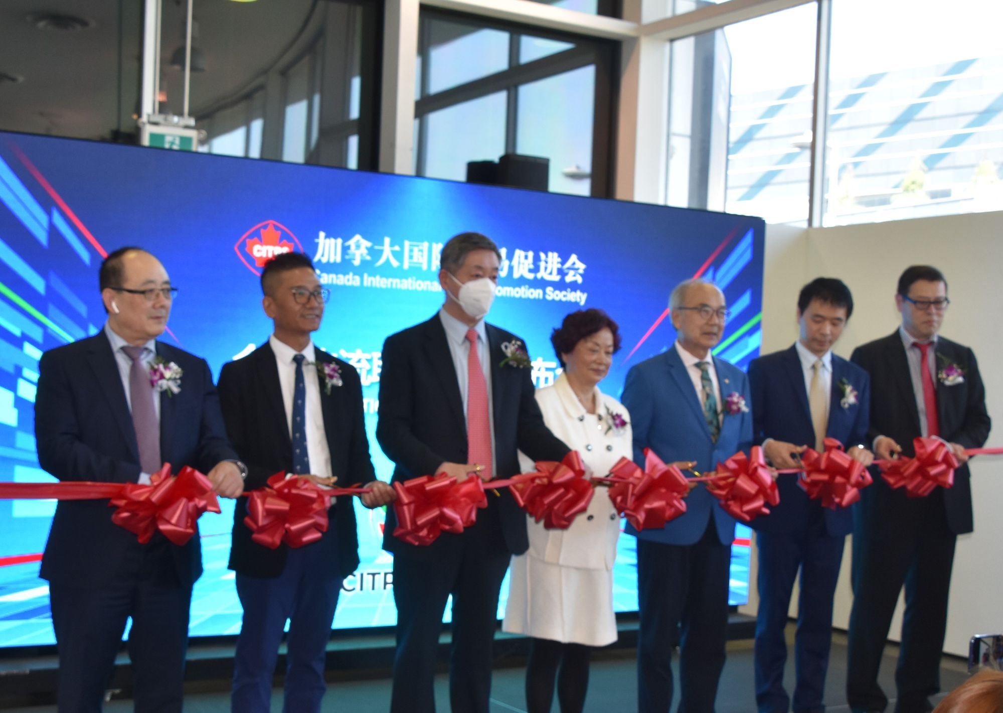 剪彩嘉宾有: 卑诗省貿易省務厅長周烱华、中国駐温哥华总领馆经济商务参赞俞善君、加拿大国际贸易促进会会长郑小玲、加拿大国际贸易促进会执行会长/贸促会仓储物流联盟发起单位Canada Brightway Shipping Ltd.总裁刘宏、贸促会仓储物流联盟发起单位北美商谷发展有限公司副总经理朱春雄、贸促会仓储物流联盟发起单位迅峰国际总裁孙剑、贸促会仓储物流联盟发起单位凯克企业集团有限公司总裁杨红。