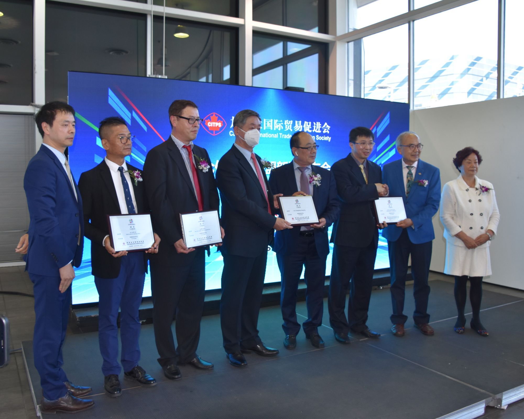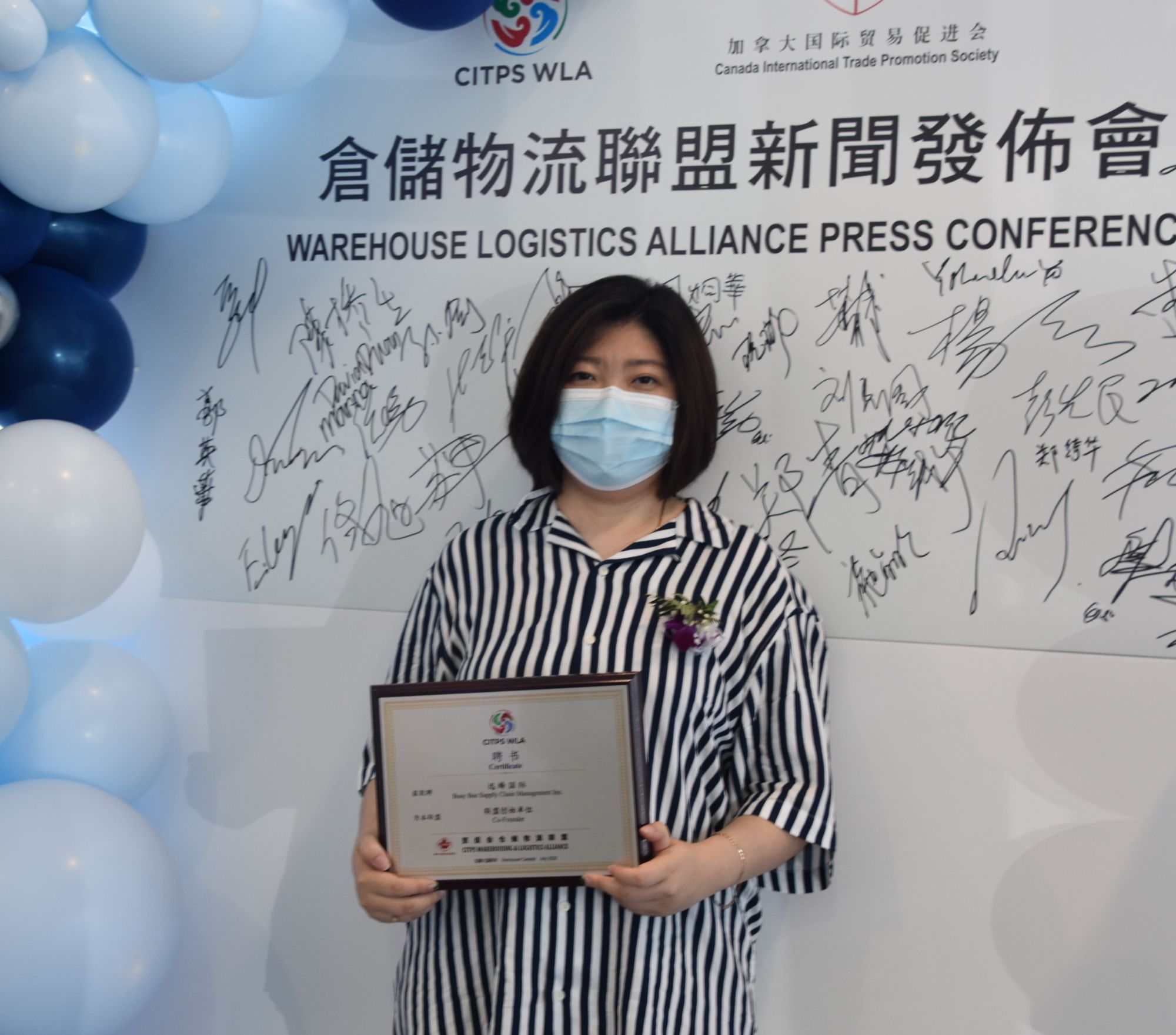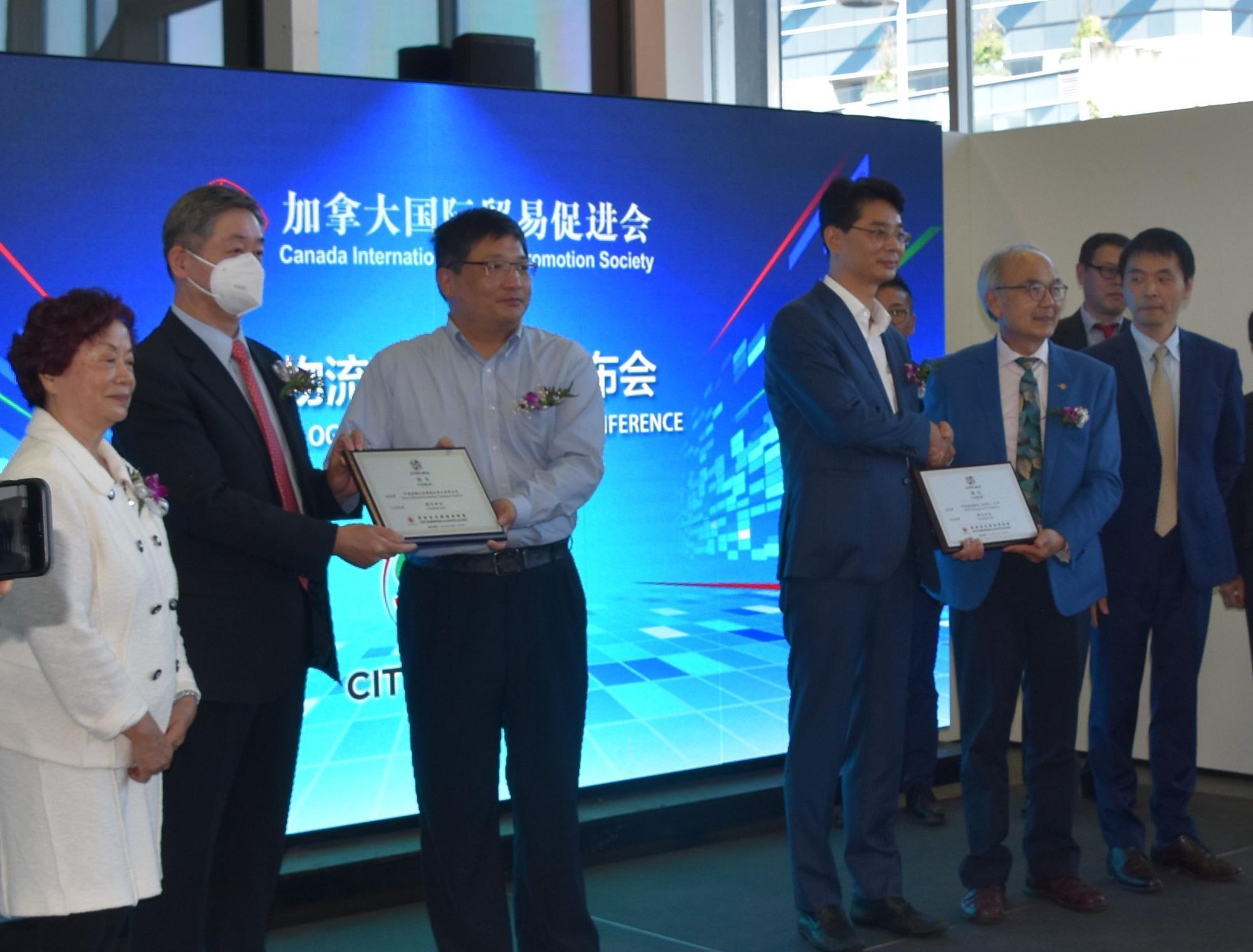 颁发证书给倉儲物流联盟顾问单位中远海运集运(加拿大)公司COSCO shipping lines (Canada) Inc 及 中国检验认证集团加拿大有限公司。