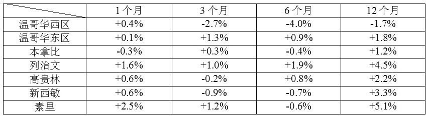 市况热络热点频出,疫情之下也概莫能外。有几个城区/社区是过去一个月内市场的热点,一个月内涨幅超过3.0%的独立屋市场都在中心城区:西温和皮特草原的独立屋市场,过去一个月内均飙涨了4.1%!!高贵林港的独立屋市场一个月内也疯涨了3.8%。高贵林和枫树岭的独立屋市场也涨幅可观,过去一个月内分别上涨了2.3%和2.8%。远郊的公寓市场最近非常疯狂,威斯勒(Whistler)的公寓过去一个月飙涨了5.0%,斯高密市(Squamish)的公寓在1个月内也疯涨了4.5%。