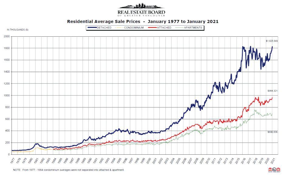 在以往8个多月的疫情阶段,温哥华地区房地产市场的成交量从3月下旬的急剧下滑,到4月份的惨不忍睹,再到5、6、7、8月份的逐月大幅增加,尤其是9、10、11、12月份的大幅超越历史平均水平并创下历史新高,市场在从波谷向波峰急剧攀升。在这样的一个背景下,各类房型的房价都在维持着持续上涨,尤其是独立屋市场,几个月来价格一直在上升。在买家和卖家愈发活跃的情况下,市场已经克服了疫情给人们带来的恐慌情绪,已经长期地、全方位地跨入了卖方市场。请看下列图表中各类指标价格在疫情期间的逐月变化: