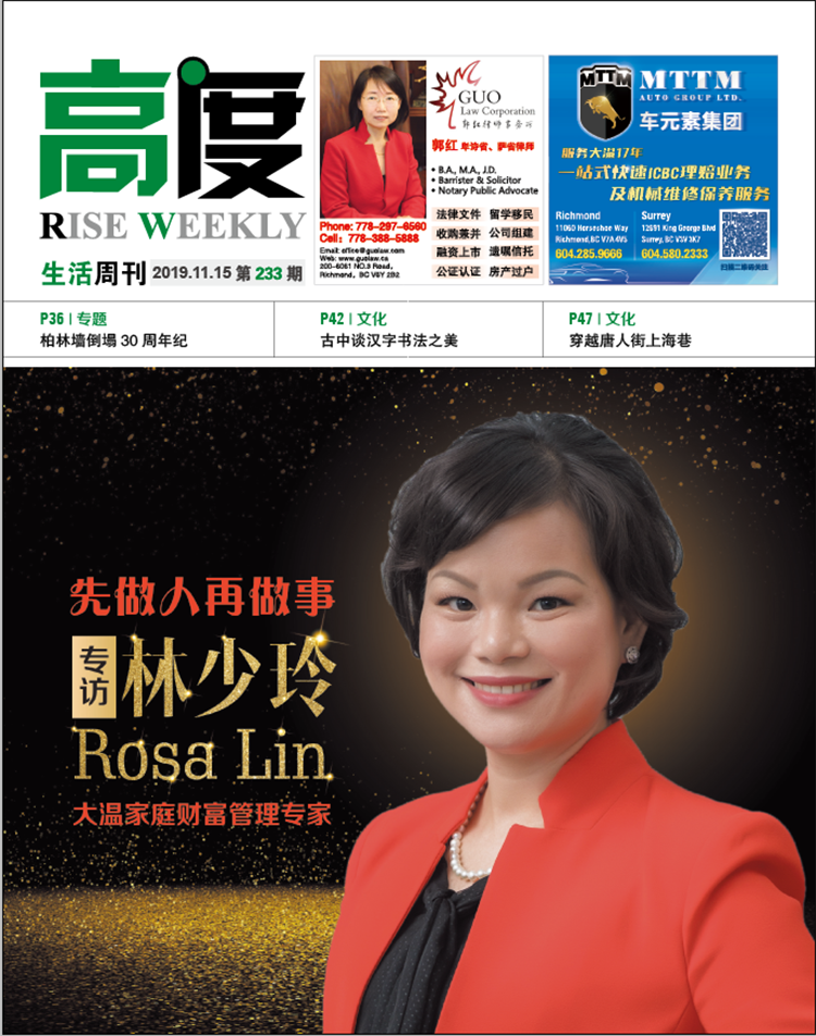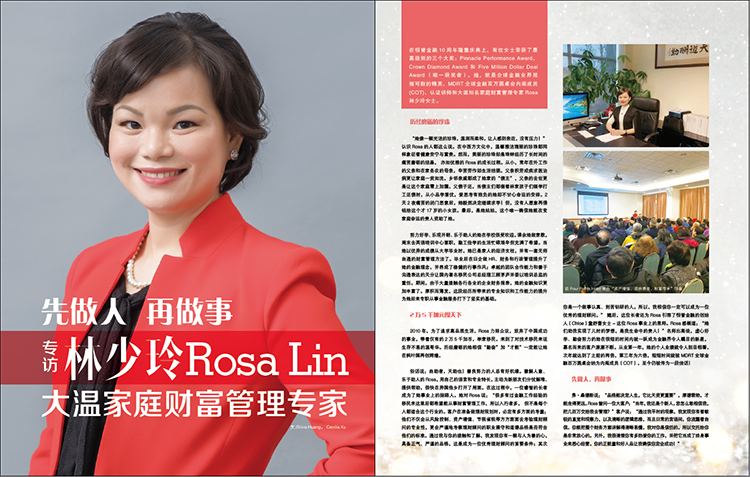 Rosa由衷地说:“我最大的成就感不是我的业绩,而是来自客户们的信任和支持,尤其是在我的事业刚起步的阶段,是他们对我的鼓励让我坚持了下去。可以说,没有他们就没有今天的我!”古人讲:“惟谦受福”。谦逊友善的Rosa更是赢得了客户的信任和青睐,把她当成知己。不但放心地把大额财产交给她管理,还不断地推荐亲朋好友给她。Rosa的客户中,有不少家庭祖孙三代都是Rosa的客户。在为他们做规划的过程中,常常有很多让Rosa非常感动的事例。一位客户在做财富传承时不明白其中所牵涉的很多税务和投资项目变更的问题,“是Rosa及时帮我避免了潜在的风险,保全了我给孩子们的财产!”客户至今仍念念不忘。还有一位客户的孙辈,在其19岁时,用Rosa为他开的免税账户开始了自我理财。他按照Rosa的建议,每年固定用自己兼职所得买满免税账户额度。5年后他结婚时,婉拒了父母资助的好意,用自己免税账户卖得的近7万加元举办了一个温馨的婚礼。“在父母全方位的关爱中长大的孩子们对于理财和规划的概念和能力相对薄弱和缺乏,所以‘授人以鱼不如授人以渔’,将先进的理财观念灌输给正在或正准备步入社会、组成家庭的新一代非常重要。”Rosa说,正如这个青年,他在理财过程中明白父母的养育之恩与赚钱不易,所以他早早就成为了经济独立有担当的人,靠着自己的努力完成了人生大事。“是Rosa传授给我的理财观念和方法,让我对自己的人生充满了信心与希望”,他很感激。