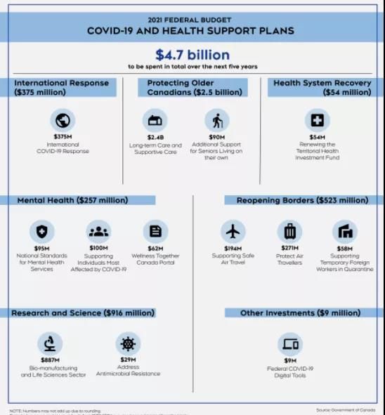 加拿大目前正遭受第三波新冠疫情的摧残,2021预算报告中的重中之重也自然是抗击新冠。报告中概述了一项120亿加元的支出计划,延长了几个关键的商业扶持和补助项目。同时,联邦政府在报告中承诺将继续采取其他收入支持措施,同时计划重新开放加拿大的国境线。