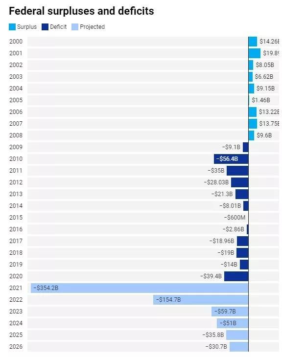 预算报告中加拿大2020-21财年的赤字约为3542亿加元,别看数字大,它比联邦政府在2020年秋季报告中预测的3816亿以及加拿大国会预算官员预测的3634亿要低上不少。