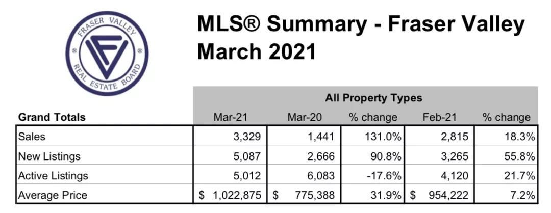 菲沙河谷地产局(Fraser Valley Real Estate)发布的数据显示,2021年3月份创下了两个历史第一,自1921年以来一个月内房屋的销售量和新上市数量的纪录。