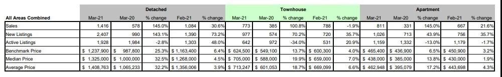 同样的情况在大温地区也在上演,根据大温地产局(REBGV)最新发布的数据,房屋买家和卖家的交易活动达到前所未有的水平 ,3月份整个地区的房屋销售量激增至5708套,比2020年3月的2424套增加了126%。3月的销售量比2月份高出53%,超过10年来3月的平均销售水平72.2%,创下了历史纪录。