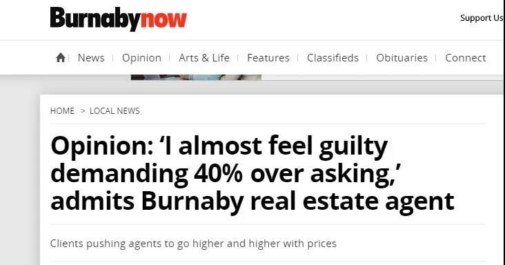 据Burnabynow的报导,一位本拿比的地产经纪说:“我所代表的卖家看到了抢房的情况,不断地催促我把价格推得越来越高,买家们都在排队出价,我不得不告诉他们需要出更高的价格,才有机会买到这栋房子。当要求买家出价高于要价的40%时,我虽然感到对买家有点内疚。但买家如果需要抢下Offer,就别无选择。”