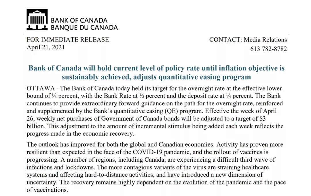在利率决议公布后的发布会上,加央行行长Tiff Macklem表示,一季度的经济数据比起一月时的预期显著更强,部分反映出了国际经济的复苏。真正使得数据远超预期强劲的是加拿大家庭和企业的韧性和适应能力,第二波疫情引发的封锁政策对于经济造成的伤害好于前一轮,而随着相关措施放松,二、三月经历了经济快速反弹并增加了大量就业岗位。眼下的第三轮疫情是最新的挫折,可能会造成就业领域出现一些反复,但最近几个月的经济表现增加了我们对经济复苏的潜在力量的信心。