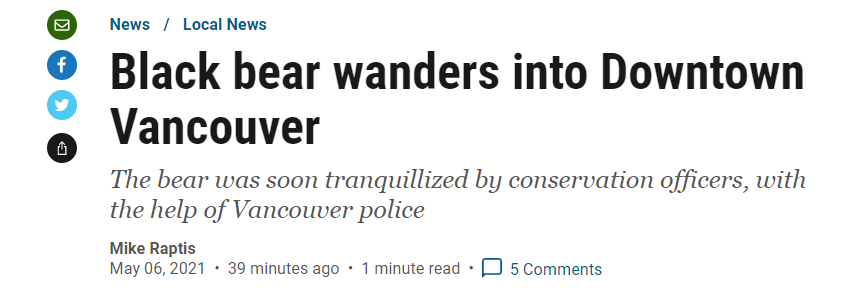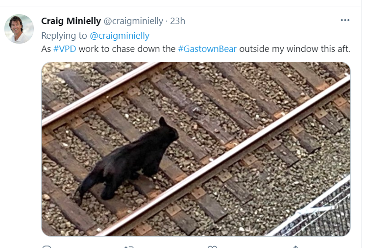 该推特用户是一名摄影师,周二下午他听见有人大喊大叫,一看原来是一只笨拙的大黑熊闯进温哥华市中心地煤气镇,在铁路上溜达,警方和野生动物保育官员一路跟踪黑熊直至温东的赫特利街(Heatly Ave)附近时,使用麻醉针将其捕获。