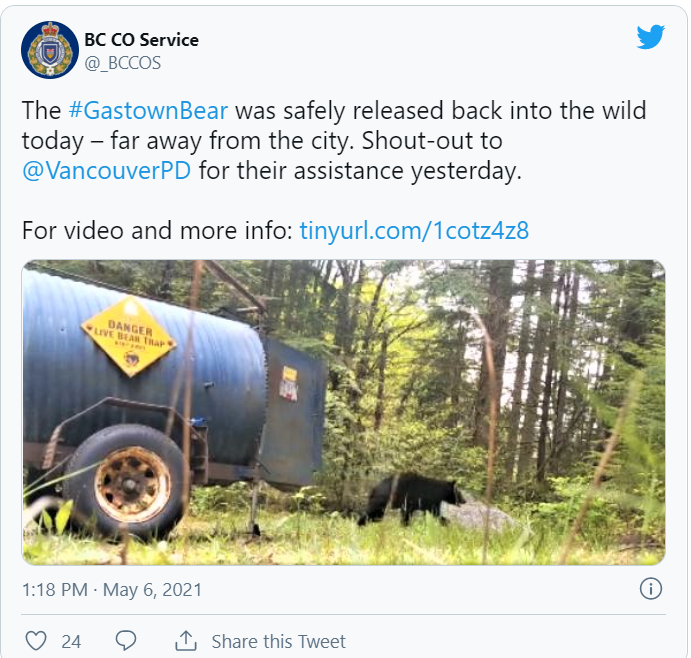 5月6日,省环境厅表示,这只黑熊已经被放归了Sea To Sky地区,不过目前还不清楚它是如何闯入闹市区。