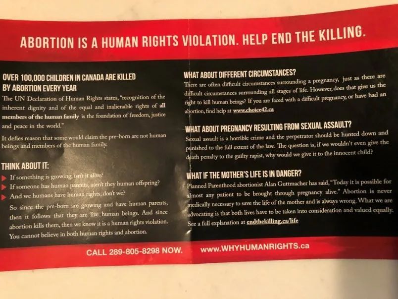 “我家7岁和4岁的孩子外出帮邻居取邮件,后来我发现他们坐在邻居门前的草坪上,看着那本恶心的反堕胎小册子。4 岁的孩子被吓得尖叫着跑到他房间。我打电话给皇家骑警,他们说会致电相关公司,建议他们不要那样分发传单,但他们似乎并不在乎找到分发传单的人。”