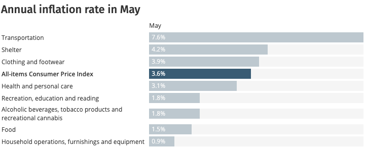 受住房和乘用车价格大涨推动,跟去年价格暴跌相比的基数效应影响有所缓解。加拿大统计局说,通胀年率从4月份的3.4%升至3.6%。这略高于分析师预期的3.5%的通胀年率。