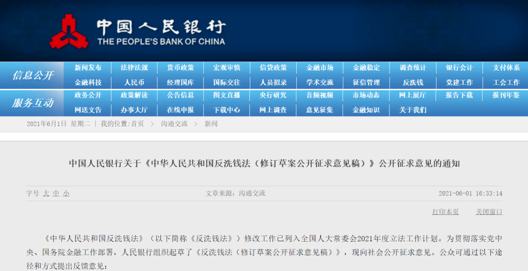 北京时间6月1日,中国人人民银行正式发布《中华人民共和国反洗钱法(修订草案公开征求意见稿)》。