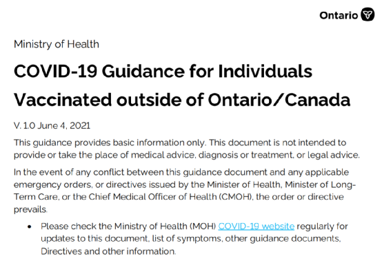 6月4日,加拿大安大略省卫生厅发布了1.0版本的《关于个人在安大略省/加拿大境外接种新冠疫苗的指南》,里面详述了其认可的新冠疫苗及两针疫苗的接种间隔时间。