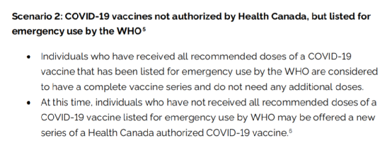 情况二:接种了未被加拿大卫生部授权使用、但已被世界卫生组织(WHO)批准紧急使用的疫苗
