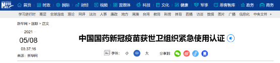 除上述的辉瑞、莫德纳、阿斯利康和强生疫苗外,据新华社日内瓦当地时间5月7日报道,世界卫生组织当天宣布,由中国医药集团北京生物制品研究所研发的新冠灭活疫苗正式通过世卫组织紧急使用认证。