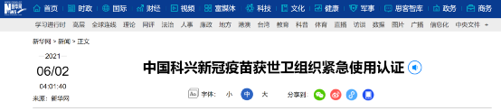 此外,据新华社日内瓦当地时间6月1日报道,世界卫生组织当天宣布,由中国北京科兴中维生物技术有限公司研发的新冠灭活疫苗“克尔来福”正式通过世卫组织紧急使用认证。