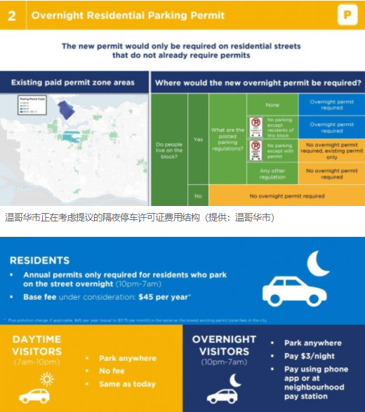 此外,该提案还计划将引入新的过夜许可证模式。如果温哥华居民,想在晚上10点到第二天早上7点、于标有“除此街区居民外禁止停车”(no parking except residents of this block)的街道停车,则每年需要给市政府支付45加元的停车费。
