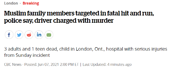 据CBC报道,这5个路人是一家人。4名死者分别是74岁的祖母、46岁的父亲、44岁的母亲和15岁的姐姐。这个家里唯一一位幸存者是个9岁的男孩,他也因伤势过重而住院观察。