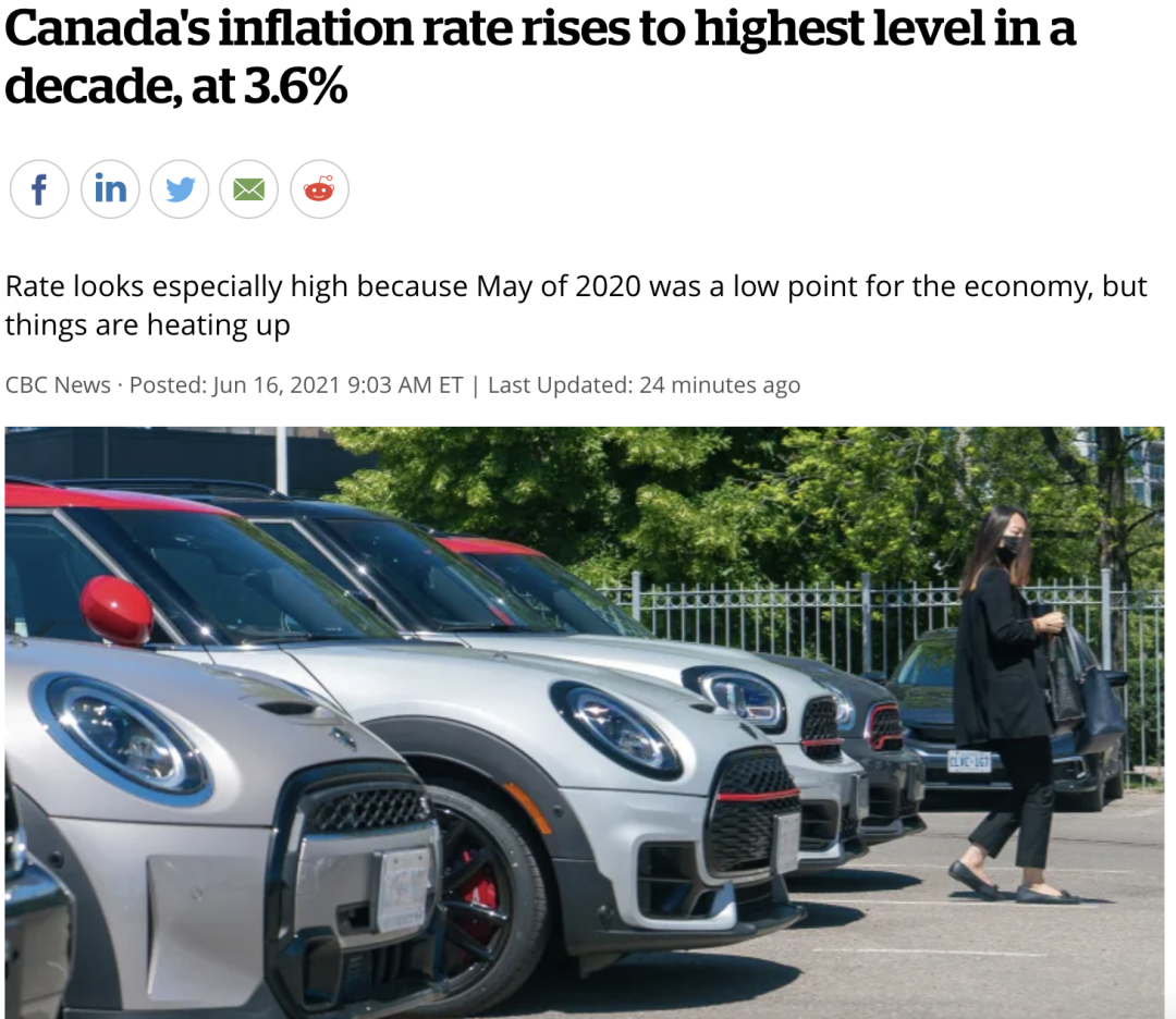 与此同时,加拿大统计局(Statistics Canada)表示,加拿大5月份通胀率升至3.6%,为10年来最快增速。该数据机构在6月16日的一份新闻稿中说,几乎所有东西的成本都在以比平时快得多的速度上涨,从住房和车辆,到食品、能源和消费品。