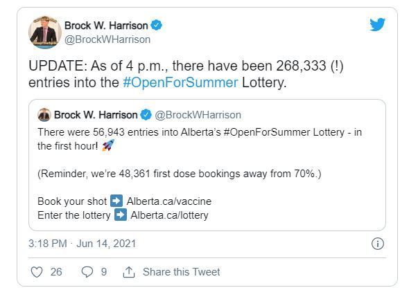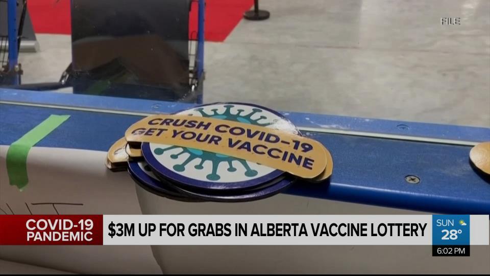6月14日下午,阿尔伯塔省省长康尼(Jason Kenney)宣布,接种了新冠疫苗的18岁以上阿省居民,可以参与“疫苗彩票”的抽奖,抽奖将分三轮进行,每轮的头号大奖都是100万加元。