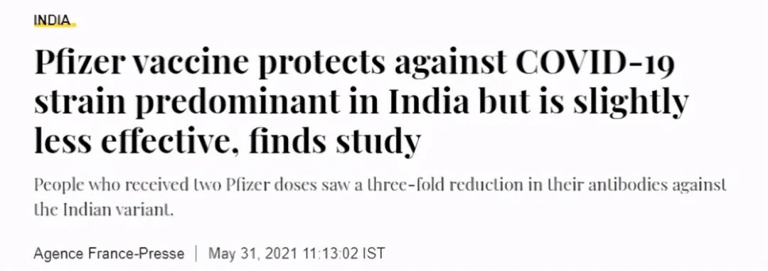 据印度媒体报道,有研究发现,辉瑞疫苗可预防在印度发现的新冠变异毒株,但效果稍差。