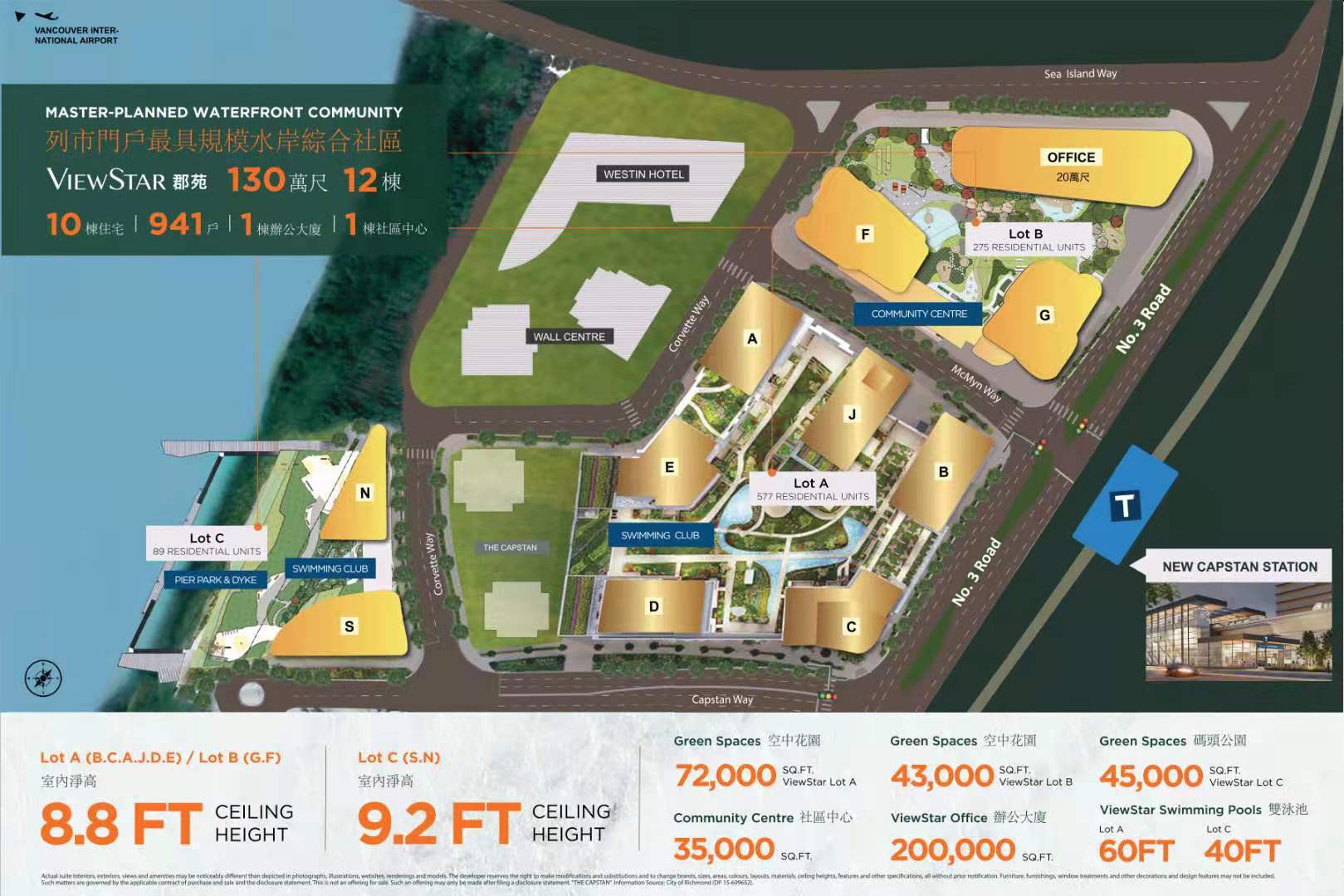郡苑本身是一个商业住宅集群,总发展面积 130 万平方英尺,占地约35 万平方英尺,由12 栋华厦组成(含列治文北社区中心)共941 个套房,分为Lot A 南区,Lot B 北区和Lot C 西区。其中Lot A 南区6 栋住宅577个套房,Lot B 北区住宅275 个套房和1 栋20 万平方英尺的商业大厦(每层2 万平方英尺),Lot C西区2 栋住宅89个套房(一梯一户)。