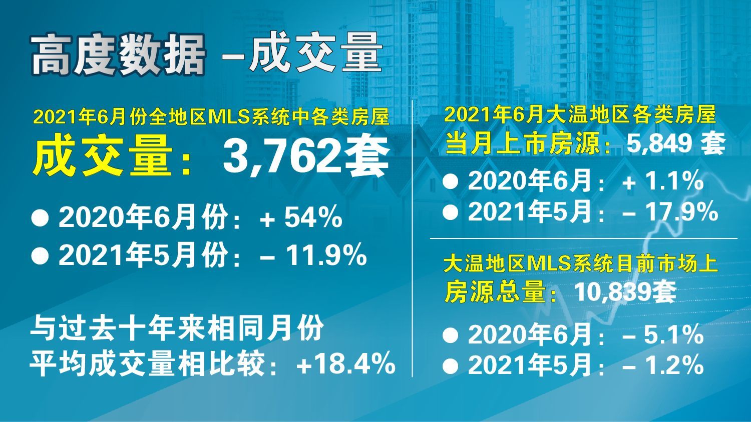 在成交量方面,温哥华地区房地产协会的数据报告显示,2021年6月份全地区MLS系统中各类房屋的交易总量为3,762套,与2020年6月份相比大幅增加了54.0%,与2021年5月份相比减少了11.9%。上个月的总成交量与过去十年来相同月份成交量的平均值相比,大幅超越了18.4%。 2021年6月大温地区各类房屋的当月上市房源为5,849套,与2020年6月相比增加了1.1%,比2021年5月份减少了17.9%。大温地区MLS系统目前市场上的房源总量为10,839套,比2020年6月减少了5.1%,与2021年5月份相比也减少了1.2%。