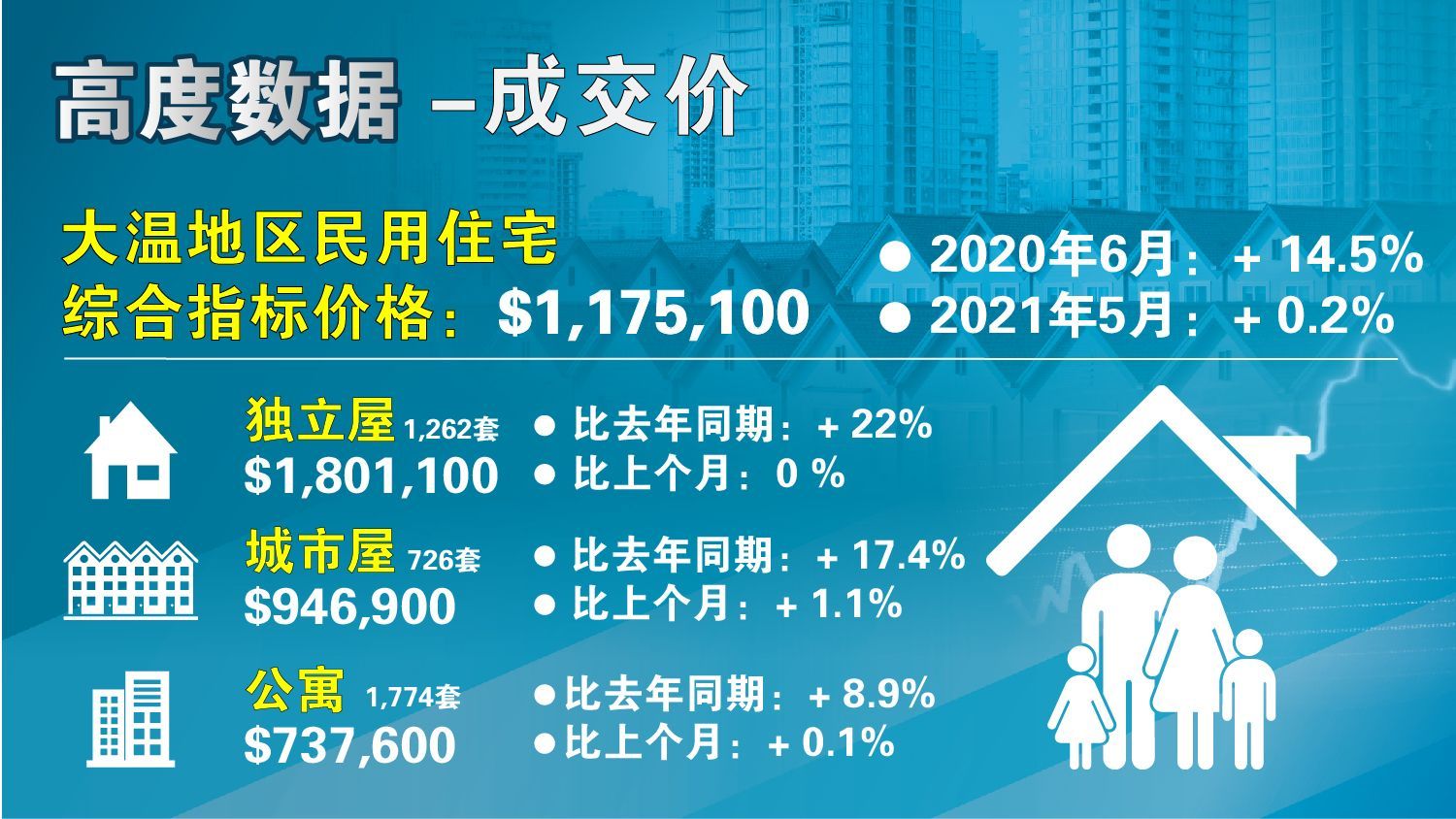 在以往16个月的疫情阶段,温哥华地区房地产市场的成交量从去年3月下旬的急剧下滑,到4月份的惨不忍睹,再到5、6、7、8月份的逐月大幅增加,尤其是9、10、11、12月份的大幅超越历史平均水平并创下历史新高,市场在从波谷向波峰急剧攀升,2021年年初开始,尤其在3、4、5月间,市场进入了几近疯狂的状态。在这样的一个背景下,各类房型的房价都在维持着持续上涨,尤其是独立屋和城市屋市场,一年多来价格一直在上升。6月份的市况有所趋缓,但依然处于极热的卖方市场。请看下列图表,观察过去12个月内各类指标价格的逐月变化: