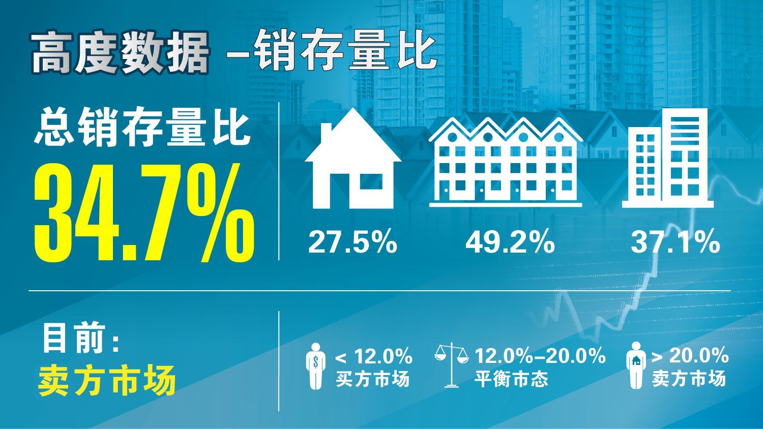 房地产协会官方数据表明:每当销存量比小于12.0%的时候,市场价格就面临下行压力,我们称之为“买方市场”;每当销存量比处于12.0%至20.0%之间的时候,市场价格平稳,我们称其为“平衡市态”;每当销存量比大于20%的时候,市场价格就会获得上行的推力,“卖方市场”因此形成。